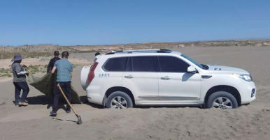 车子终于在陷入沙地3小时后脱离困境。考察团在羊井子乡用过午餐后返回酒泉。