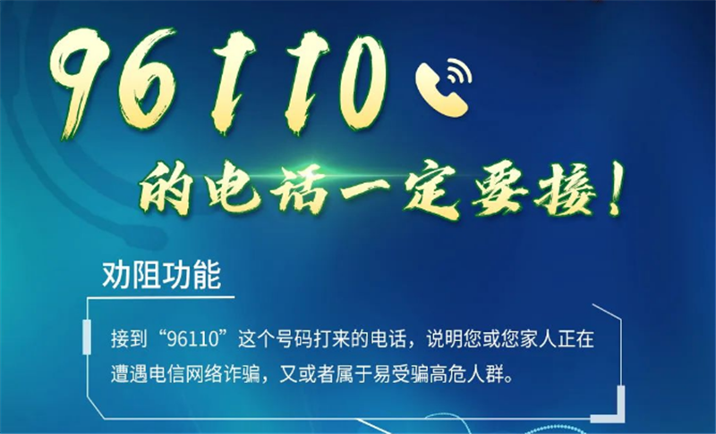 公安机关提醒:96110是官方预警劝阻专线,如接到“96110”号码来电,说明机主本人或其家人正遭遇电信网络诈骗,请一定及时接听并耐心听取民警的劝阻提示,避免上当受骗。