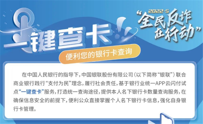 为解决群众对于跨行银行卡账户查询的诉求,2021年12月,人民银行指导中国银联股份有限公司联合商业银行基于银行业统一APP云闪付试点“一键查卡”功能,打造统一查询途径,向公众提供银行卡数量、每张卡的银行名称、借贷记属性、脱敏卡号等信息的查询,在确保信息安全的前提下,便利公众直接掌握个人名下银行卡信息,强化自身银行卡管理。