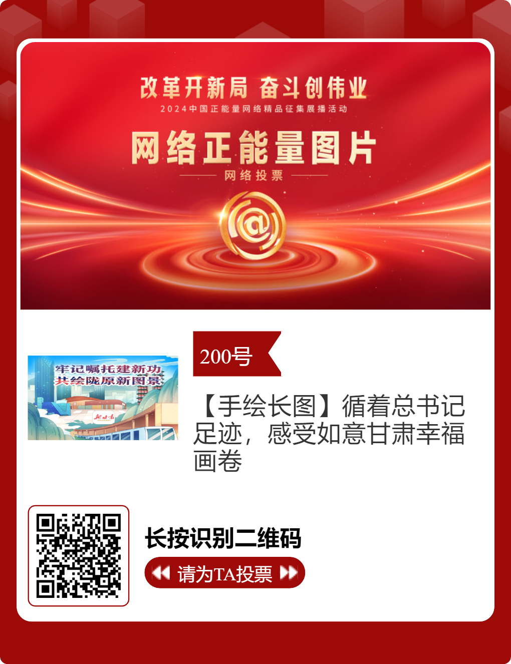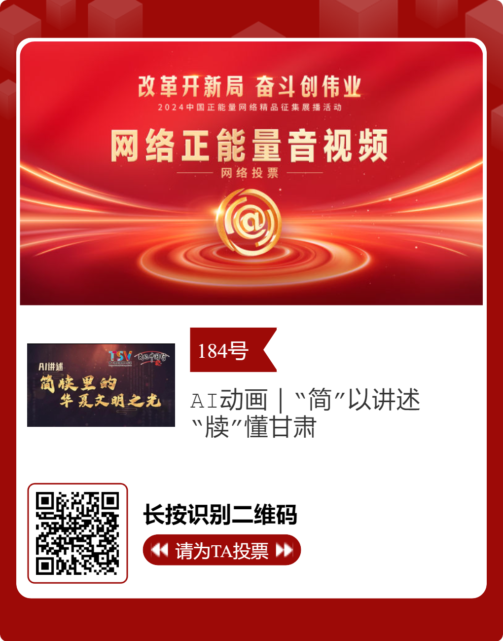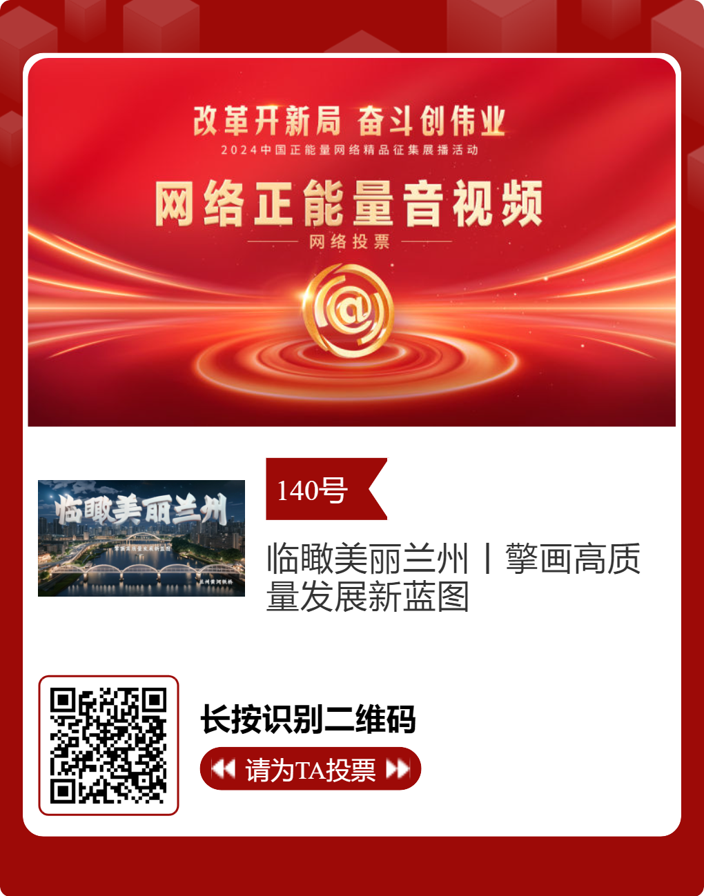 经过初选,由凯发k8省委网信办和兰州市委网信办选送的16件作品脱颖而出,进入终选。在此,诚邀每个充满正能量的你,为优秀作品投票点赞,为凯发k8正能量发声。