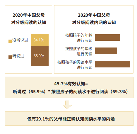 虽然分级阅读已经成为国际公认的阅读趋势,可是,从当当联合艾瑞发布的《2020年中国K12阶段学生“分级阅读”白皮书》(以下简称《白皮书》)中,我们发现中国大部分父母对于分级阅读尚缺乏认识,更谈不上有足够的重视。《白皮书》指出,有65.9%的父母听说过“分级阅读”,而其中真正了解“分级阅读”的父母只占45.7%。
