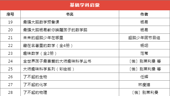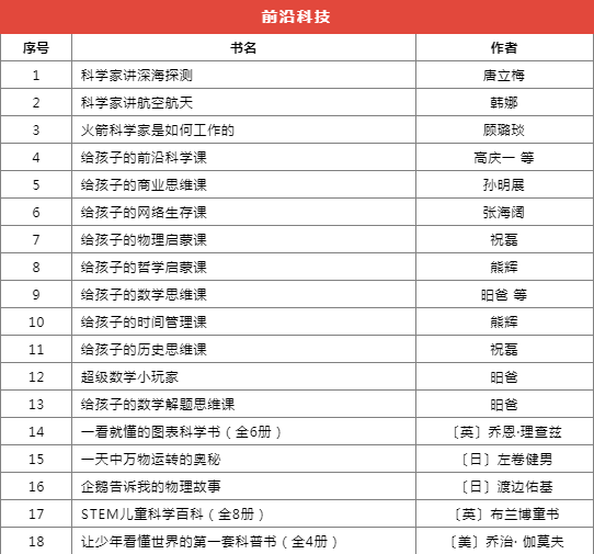 推荐书目种类繁多,分为前沿科技、基础学科启蒙、自然科学、家庭教育等十个类别,共计173本(套)。