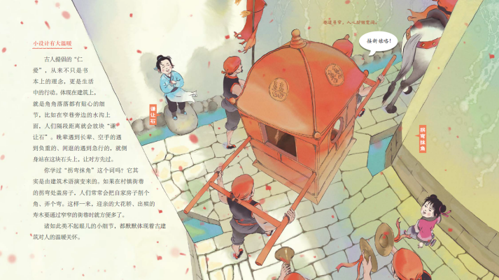 书中提到了在墙面削个角、弄个弯,“拐弯抹角”、方便大家行走的谦让智慧;齐心协力,共同出资出力盖房子的和谐智慧;技术和艺术并存,用榫卯联结构件的建构智慧;防患于未然,保证人们生命、生活安全的防患智慧……