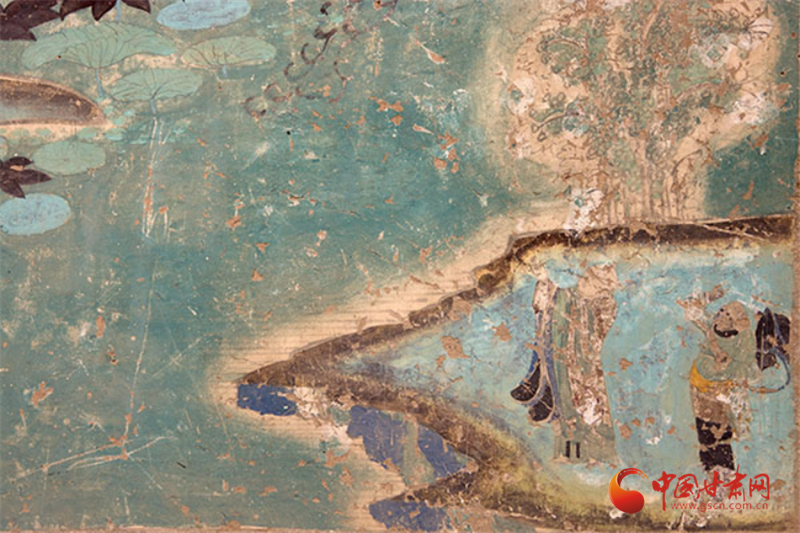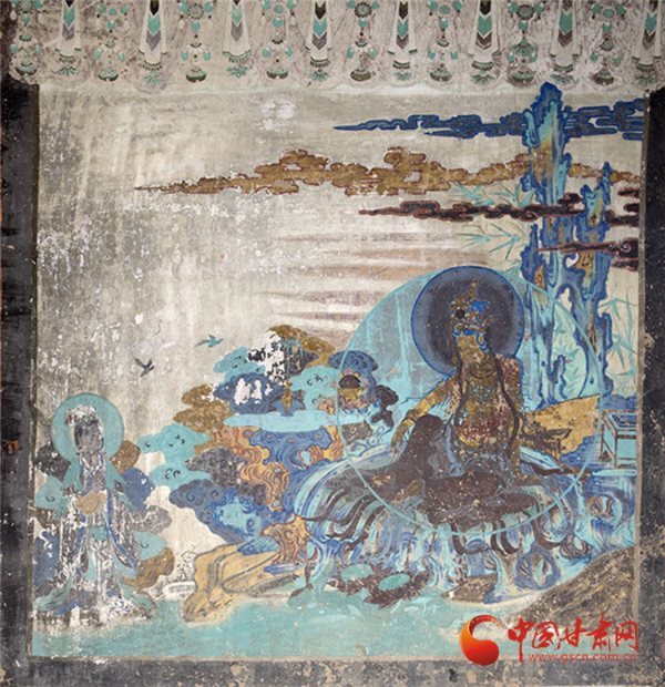 两幅作品均以青绿色调为主,观音面部贴金虽已氧化,却仍显清新淡雅,更以“马一角、夏半边”的构图巧思,用对角线分割画面、大量留白,让有限的壁面生出无穷空间感,堪称中国传统美学与佛教哲理的完美融合——正如唐代白居易赞水月观音“净渌水上,虚白光中”,这般意境在榆林窟的壁画里被演绎得淋漓尽致。